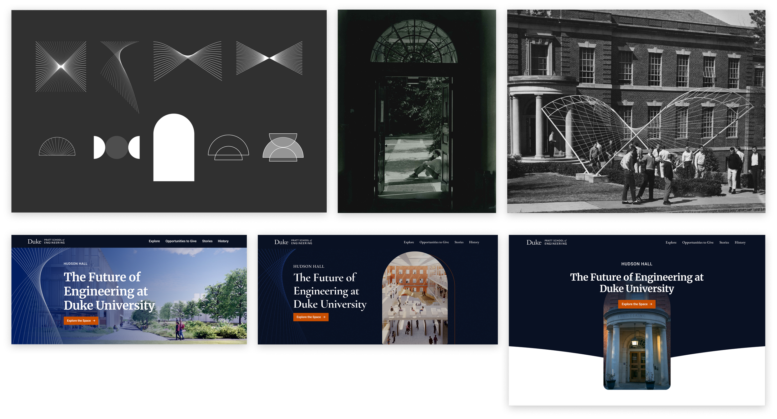 Option A, the design I led, is light, sophisticated, refined. It embraces familiar elements such as the archway featured on the Duke Engineering Website.